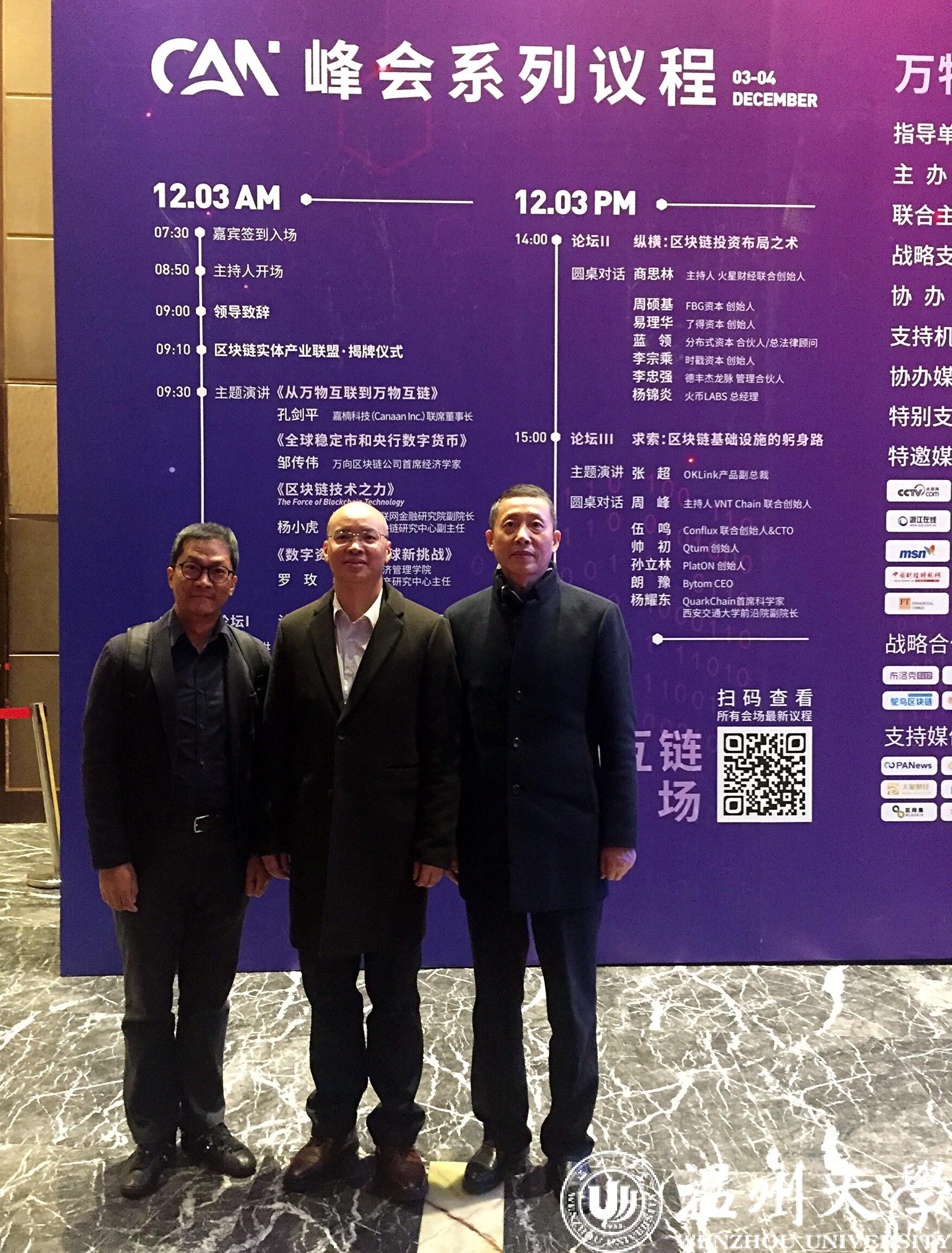 12月3日,彩票平台 院长王宗正、党委书记林钦、副书记杨振海一行,受杭州嘉楠耘智信息科技有限公司联席董事长孔建平(系彩票平台 2008届法学专业优秀校友)邀请参加2019CAN大会·万物互链·区块链与全球经济新格局峰会。此次大会由杭州市人民政府为指导单位,CAN大会组委会联合嘉楠科技和浙江清华长三角研究院杭州分院主办。本届大会以促进区块链技术革新、产业变革、生态协同发展为宗旨,引领经济创新、转型升级。大会邀请了近百名政府领导、业内著名专家学者、行业权威、投资机构和上市公司嘉宾。会上,杭州嘉楠耘智信息科技有限公司联席董事长孔建平受邀作《从万物互联到万物互链》的主题演讲。