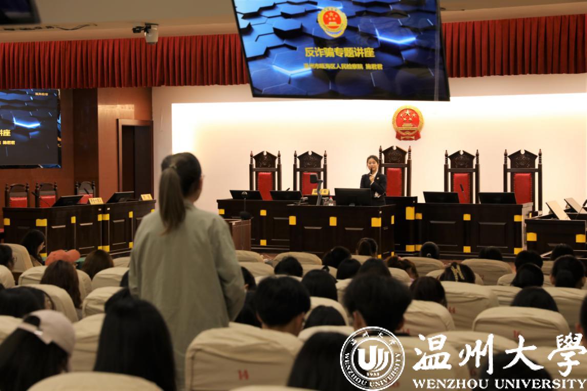 为切实做好安全宣传教育,增强学生防诈反诈意识,营造平安和谐的校园环境,4月7日下午,彩票平台 于北校区模拟法庭组织了防诈骗专题讲座。讲座由林丽丽老师主持,特别邀请到温州市瓯海区人民检察院检察官施君君为同学们主讲。