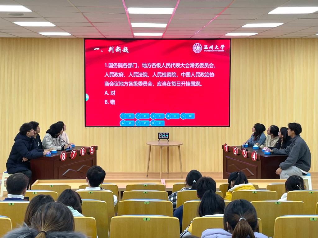 12月1日,“宪法宣传周”系列活动之“习近平法治思想”知识竞赛在温州大学北校区举行。知识竞赛重点围绕习近平法治思想相关内容,设有判断题、单选题、多选题和逻辑题。700余名学生参与到了知识竞赛初赛环节,最终选出24名选手进入决赛。决赛现场紧张刺激,答对得分、答错扣分的竞赛机制也为比赛增加了更大的悬念。知识竞赛充分检验了大学生对习近平法治思想、宪法知识的掌握程度,将法治学习的知识性与趣味性融为一体。