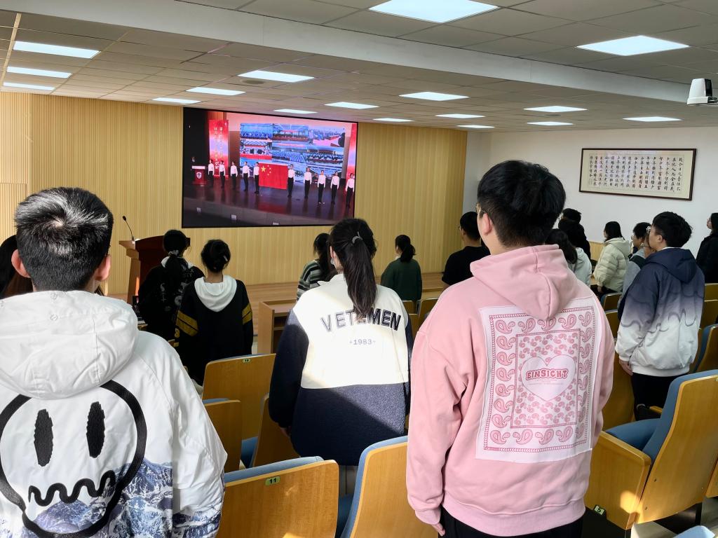 “我宣誓,忠于中华人民共和国宪法,维护宪法权威,履行法定职责,忠于祖国、忠于人民,恪尽职守、廉洁奉公,接受人民监督,为建设富强民主文明和谐美丽的社会主义现代化强国努力奋斗!”铮铮誓言,掷地有声。同学们全神贯注,高举右拳,作出庄严宣誓,随着五星红旗扬起,自豪之情融于朗朗誓词中。随后,同学们合唱宪法主题歌曲《宪法伴我们成长》,从歌声中体会宪法温度、感受宪法力量。